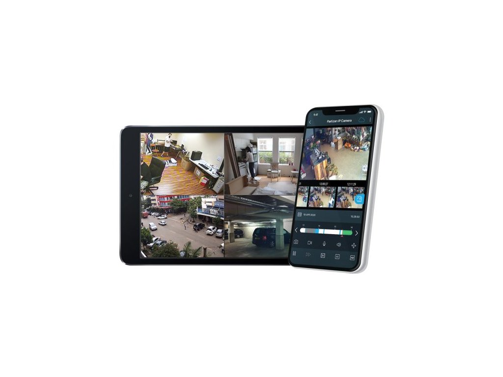 Kamera má vstavaný mikrofón a reproduktor, vďaka čomu môžete počúvať aj hovoriť na diaľku. Podporuje Wi-Fi 2,4 GHz s dvojitou anténou aj káblové pripojenie RJ-45 (Ethernet), takže si zachováva stabilné spojenie. Je kompatibilná s ONVIF 2.4 a umožňuje ukladanie záznamov do Partizan Cloud Storage alebo na MicroSD kartu (až do 128 GB) – aj bez rekordéra.